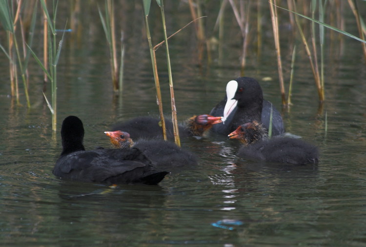 7. 8. 2008. Carwitz. Blässhuhn (Fulica atra). Blesshuhn mit Küken. Wasservogel. Schilf