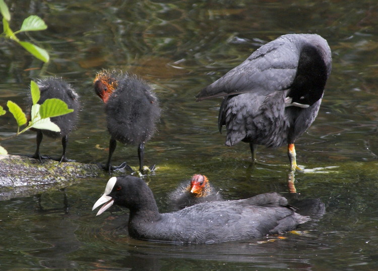2009. Berlin. Mitte. Wedding. Plötzensee. Fauna. Tiere. Vogel Wasservogel. Vögel. Blässhuhn. Blässhühner mit Küken.