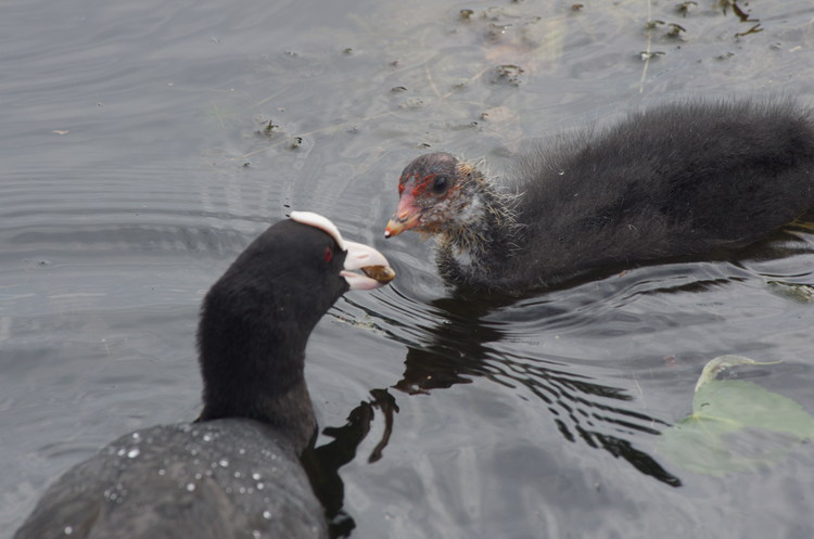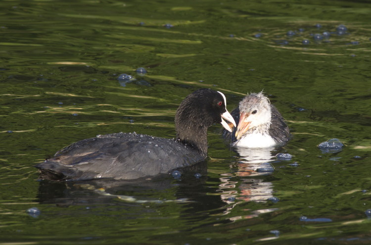 9. 7. 2013. Berlin. Tegeler See. Fauna. Tiere. Vogel. Vögel. Blässhuhn. Blesshuhn mit Küken. (Fulica atra)
