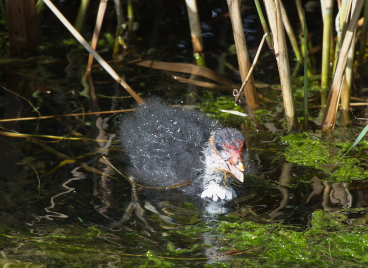 2. 7. 2010. Mecklenburg-Vorpommern. Feldberger Seenlandschaft. Carwitz. Fauna. Tiere. Vogel. Vögel. Blässhuhn (Fulica atra) , auch Blässhuhn. Familie: Rallen. Küken. Wasservogel