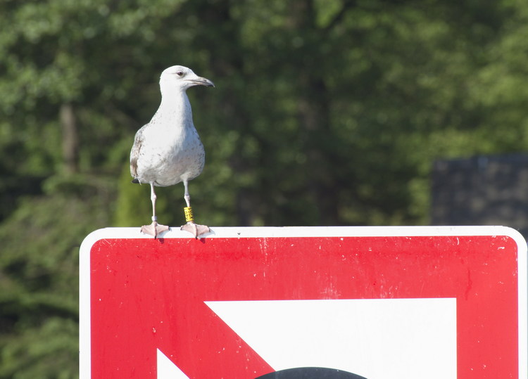 2017. Berlin. Tegeler See. Möwe auf einer Tafel für die Schifffahrt. Fauna. Vogel. Laridae