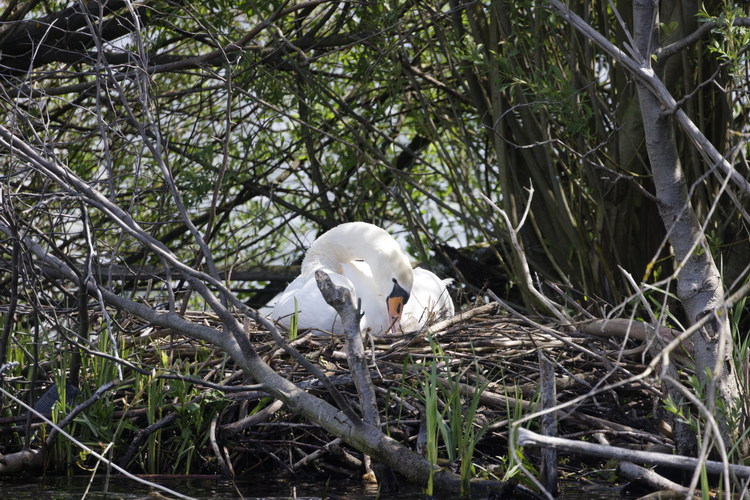 17. 5. 2021. Brandenburg. Havel / Nieder Neuendorfer See bei Hennigsdorf. Fauna. Tier. Vogel. Schwan im Nest. brüten. Cygnus