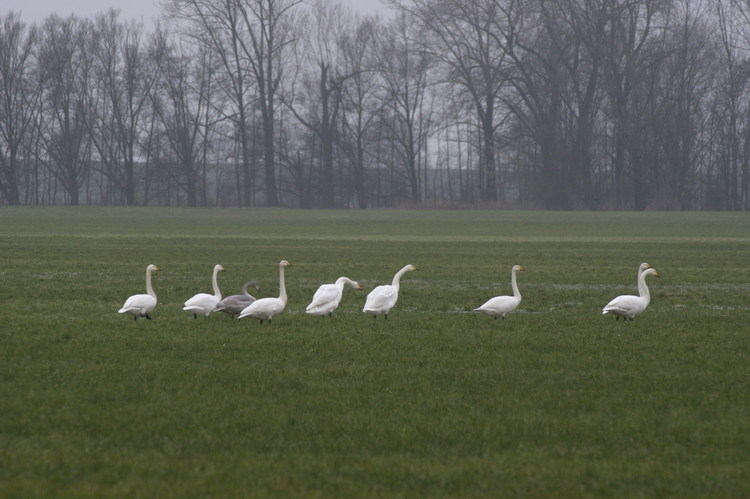 25. 1. 2015. Brandenburg. Bei Linum. Fauna. Vogel. Singschwan (Cygnus cygnus) Singschwäne auf einer Feuchtwiese