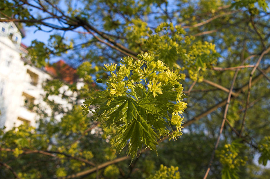 22. 4. 2007. Berlin. Flora. Pflanzen. Baum. Bäume. Blüten Spitz-Ahorn (Acer platanoides) Ahorngewächse (Araceae)