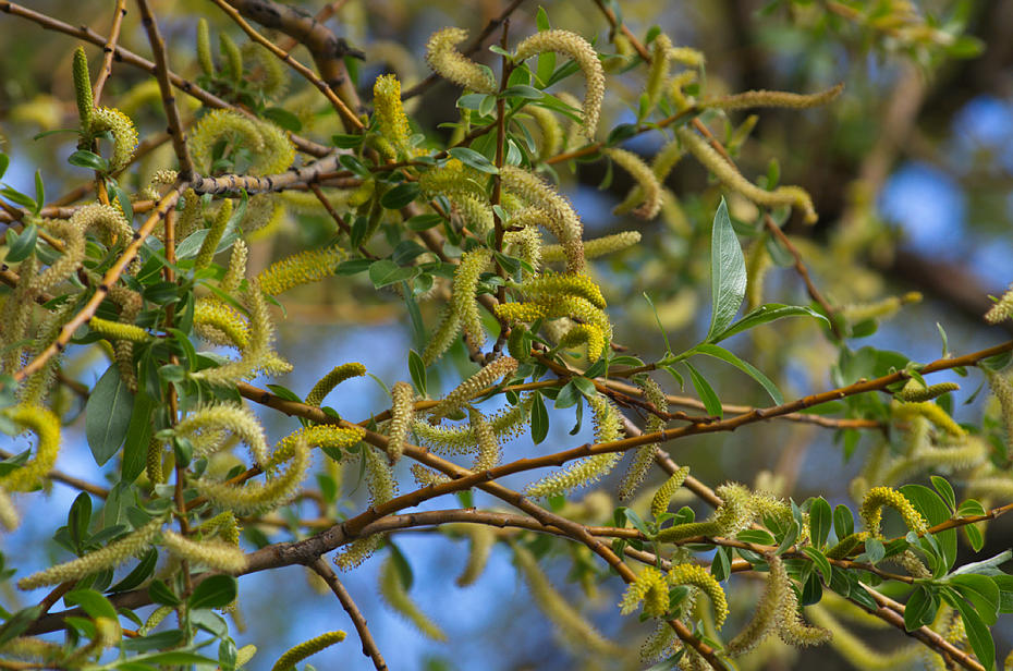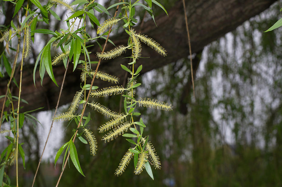 4. 4. 2014. Berlin. Flora. Pflanzen. Baum. Bäume. Trauerweide mit Blüten. Salix. Weidenkätzchen