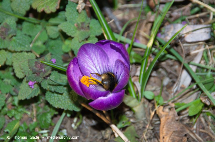 25. 2. 2014. Berlin. Flora. Pflanzen. Krokusse (Crocus) Schwertliliengewächse (Iridaceae) Hummel