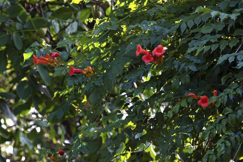8. 7. 2007. Berlin. Park Rehberge. Flora. Pflanzen. Trompetenblumen (Campsis), auch als Klettertrompeten, Jasmintrompeten. Rote Blüten