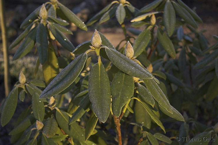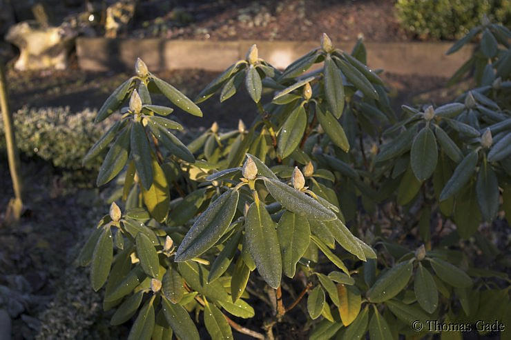 27. 2. 2006. Berlin. Wedding. Winter. Flora. Pflanzen. Strauch. Sträucher. Busch. Blüten am Rhododendron. Rhododendren. Singular: das Rhododendron. Familie: Heidekrautgewächse (Ericaceae).