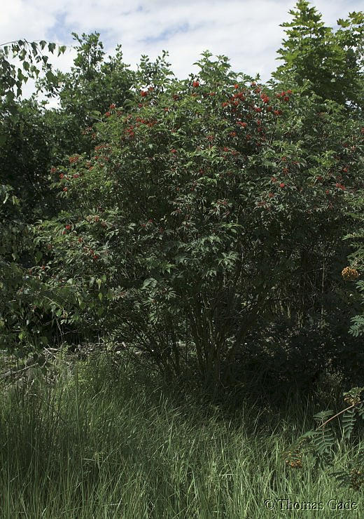 21. 6. 2009. Berlin. Tegeler Forst. Flora. Pflanzen. Strauch Sträucher. Trauben-Holunder. Traubenholunder. Familie: Geißblattgewächse