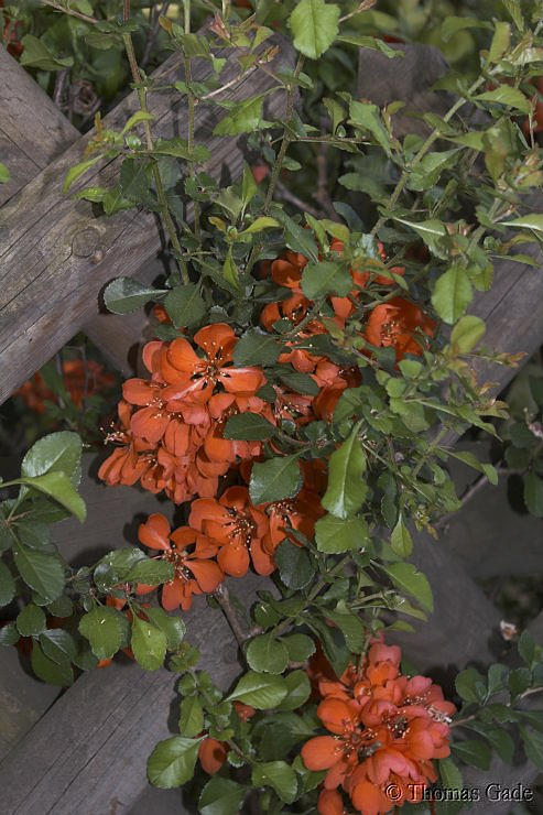 2002. Berlin. Flora. Pflanzen. Rosengewächse. Strauch. Sträucher. Zierquitte. Chaenomeles. Blüten