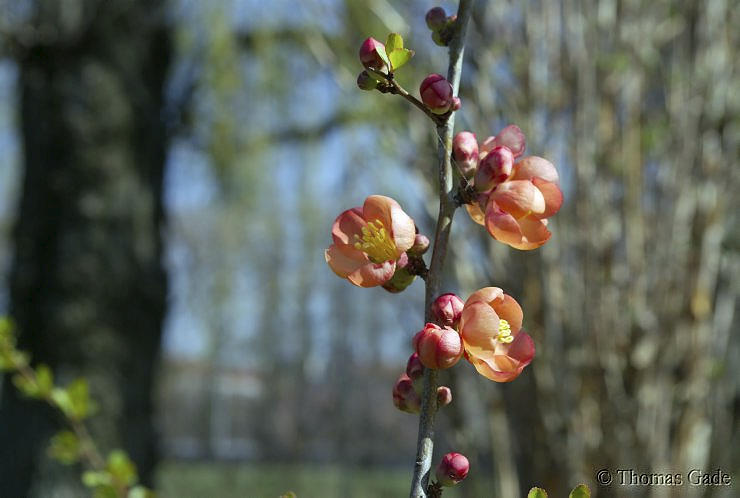 22. 4. 2007. Berlin. Flora. Pflanzen. Frühling. Japanische Zierquitte (Chaenomeles japonica). Familie: Rosengewächse (Rosaceae).