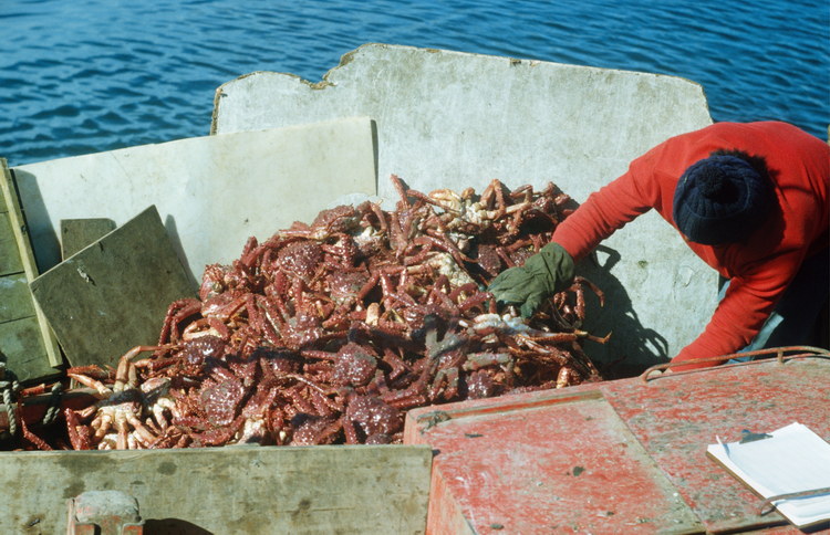 1981. Südamerika. Lateinamerika. Argentinien. Fischer auf dem Boot. Krabbenfischer, Krebse, Seespinnen. Meer. Hafen