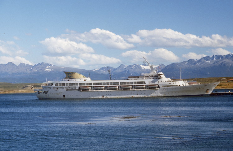 1981. Südamerika. Lateinamerika. Argentinien. Passagierschiff auf dem Meer