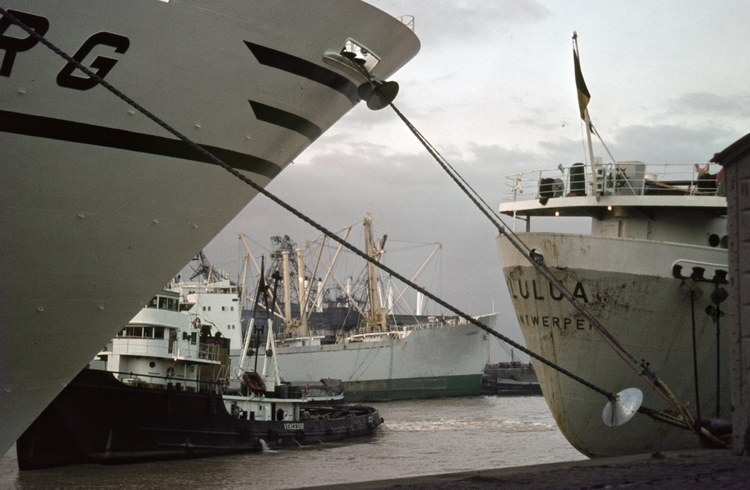 1969. Argentinien. Buenos Aires. enger Liegeplatz. Hafen. Schiffahrt. Schifffahrt. Pier. Kai. Schlepper.