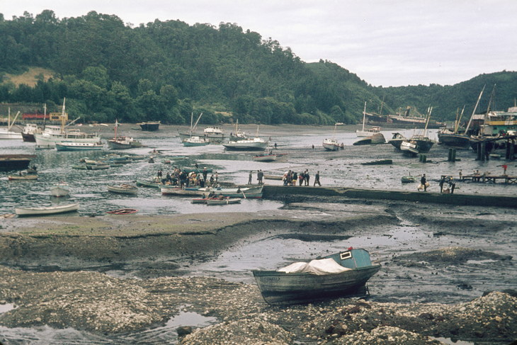 1968. Lateinamerika. Südamerika. Chile. Auf der Insel Chiloe. Bei Ebbe liegen die Boote auf dem Schlick.