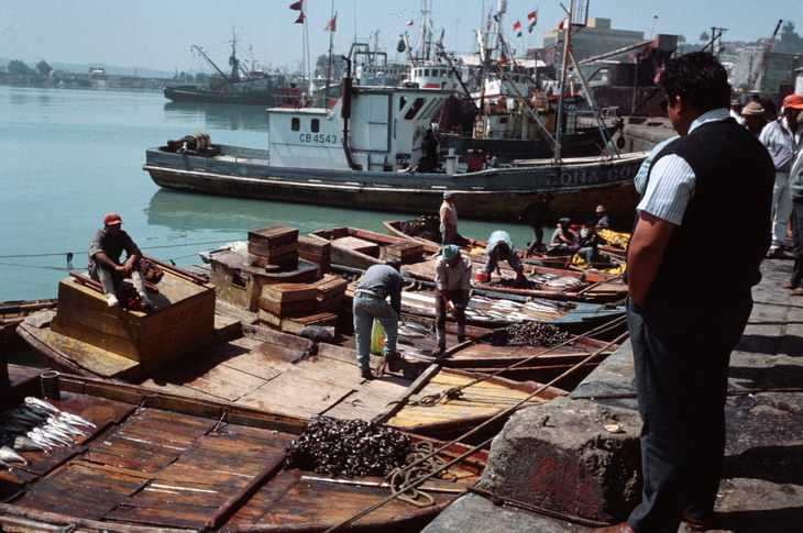 1968. Lateinamerika. Südamerika. Chile. Hafen Talcahuano, ein Sardinenfänger wird gelöscht