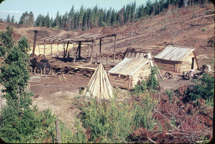 1968. Lateinamerika. Südamerika. Chile. Waldarbeiterkolonnen ernten die schlagreifen Kiefern und verarbeiten sie mit urtümlichen Maschinen, wie hier u. a. ein Lanz Bulldog, und eine alten Lokomobile, zu Brettern. Dicke Äste werden zu Holzkohle verarbeitet.