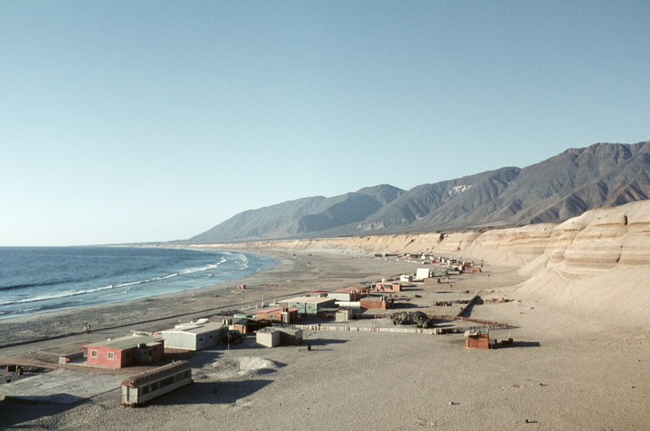 1968. Lateinamerika. Südamerika. Chile. Die letzten Überreste der einst bedeutsamsten Covadera Pabellon de Pica. Eine Covadera nennt man die Lagerstätte von Guano. Weißer Guano wird der frische Guano genannt, der hauptsächlich vor der Küste Perus abgebaut wird. In Chile förderte man hingegen fossilen, roten Guano. Er hat einen sehr hohen Phosphorgehalt. Guano entstand und entsteht aus den Exkrementen und Kadavern der Milliarden Vögel, die seit Urzeiten die Küsten bevölkern, es sind vor allem Pelikane und eine Komoranart die Guanay. Die Vögel brüten vor der Küste Perus. Die Existenz der Vögel ist durch den Fischreichtum des Humboltstroms bedingt. Bei unserem Besuch wohnte nur noch ein Arbeiter in dem Ort, der mehrmals durch Seebeben zerstört wurde. Der Mann wurde von zwei Kameraden aus Iquique versorgt, die mit einem uralten Lastwagen Wasser und Lebensmittel brachten und den geförderten Guano wieder mit in die Stadt nahmen. Die Straße war mit Walknochen dekoriert.
