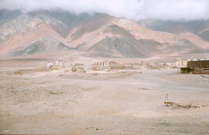 um 1969. Lateinamerika. Südamerika. Chile. Großer Norden. Gatico. In Gatico wurde das nach Cobija gebrachte Erz verhüttet. Am Ortsrand steht noch ein mehrstöckiges, ehemals sicher sehr prunkvolles Wohnhaus des Verwalters, heute eine Ruine inmitten der Reste der ehemaligen Fabriken und Arbeiterhäuser. Diese Ruinen und ein hoher Schornstein des Schmelzwerkes künden von einer kurzen, großen Zeit.