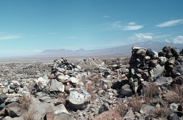 1968. Lateinamerika. Südamerika. Chile. Großer Norden. Östlich von Calama verläuft der Camino del Inca, die alte Inkastraße. Es war eine geglättete, von Steinen freigeräumte Straße, ca 3m breit. Zu beiden Seiten des Weges lagen die beiseite geräumten Steine. In regelmäßigen Abständen standen Relaistationen, in denen sich die Läufer und Meldegänger ausruhen oder ihre Meldungen an frische Läufer übergeben konnten. Man soll die Straße bis Copiapo noch heute erkennen können.