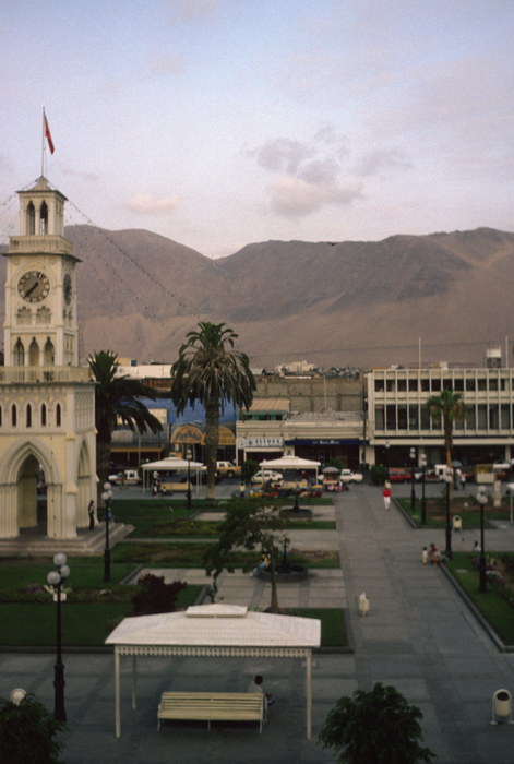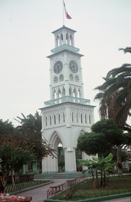 um 1969. Lateinamerika. Südamerika. Chile. Norden. Iquique, Torre del Reloj, der hölzerne Uhrenturm, der an Big Ben erinnern soll. Viele der herrlichen Anlagen mit ihrem prächtigen Pflanzenwuchs wachsen auf europäischer Erde. Die Segelschiffe brachten Blumenerde als Ballast aus Europa mit, die sie gegen Salpeter eintauschten. Der Hafen Iquique hat eine wechselvolle Geschichte hinter sich. Er war zu bolivianischer Zeit Zentrum des Guanoexports, 1855 wurde er Puerto Mayor des Salpeterhandels, im Jahre 1865 wurden 320. 000 to Salpeter verschifft, 1878 lebten schon mehr als 10. 000 Menschen in der Stadt, hunderte von Segelschiffen warteten im Hafen auf ihre Ladung. Die Blütezeit der Stadt lag etwa zwischen 1880 und 1920. Es herrschte unglaublicher Reichtum. Heute ist Iquique das bedeutsamste Zentrum der Fischmehlindustrie. Seit 1975 besteht die Freihandelszone ZOFRI.