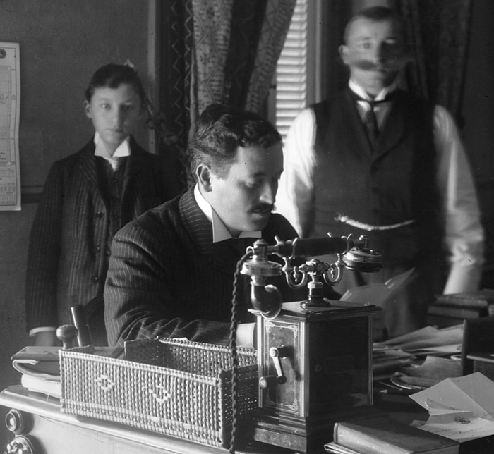 Um 1905. Europäische Baumwollhändler in Ägypten im Büro mit Telefon auf dem Schreibtisch. Kaufleute mit Kläppchenkragen.