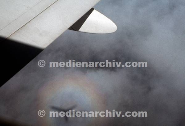 vermutlich 1975. Spanien. Kanarische Inseln. Gran Canaria. Blick aus dem Flugzeug. Wolken. Schattenprojektion des Flugzeugs auf einer Wolke mit einem regenbogenfarbigen Ring.