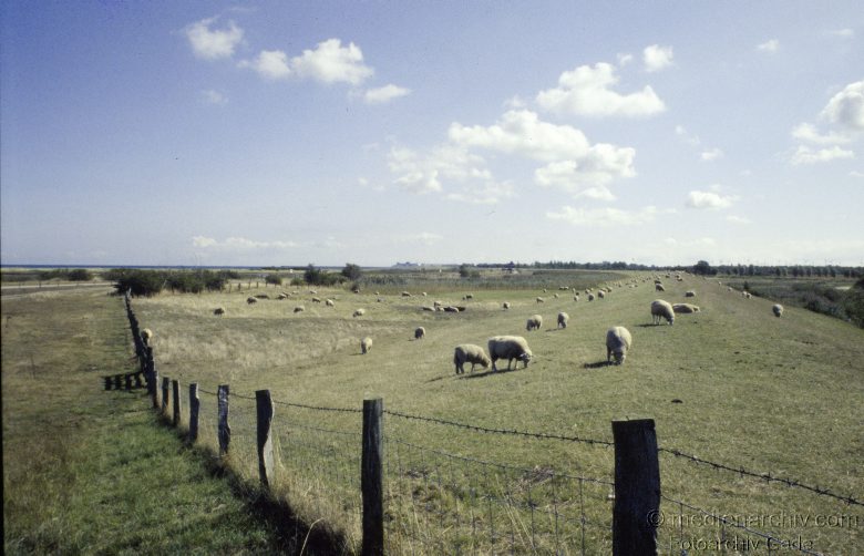 1980. Schleswig-Holstein. Fehmarn. Schafe auf dem Deich