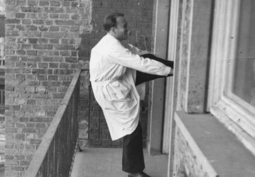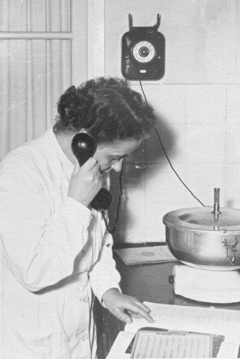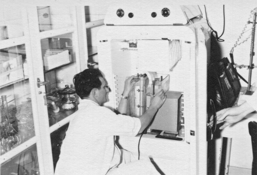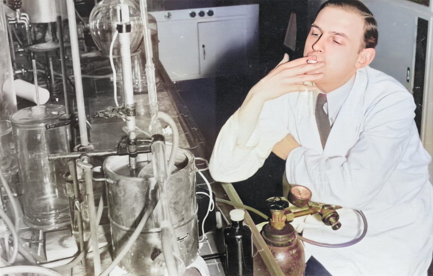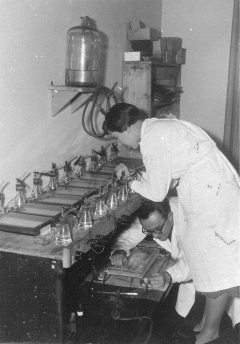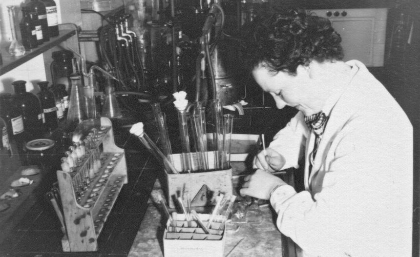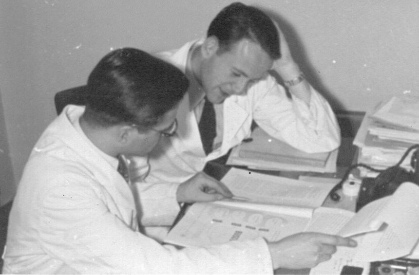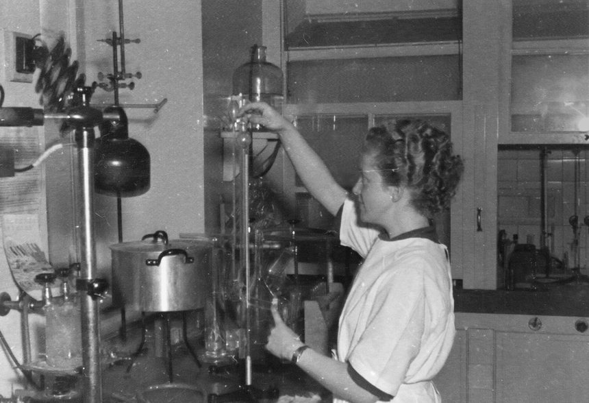Chemiestudium. Zwei Studentinnen in weißen Kitteln. Das Foto wurde mit Adobe Photoshop restauriert und coloriert.