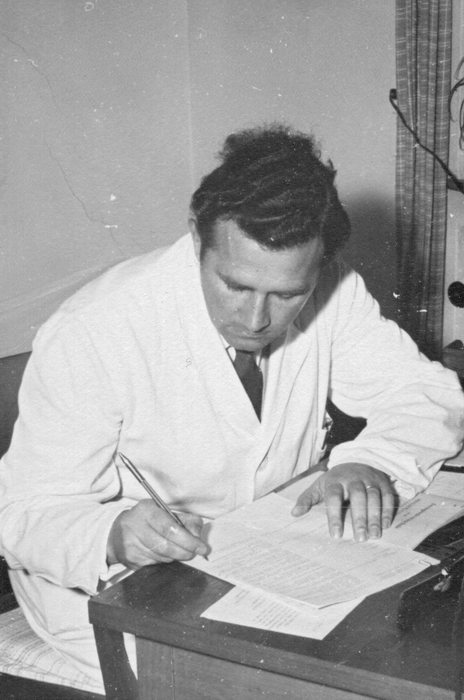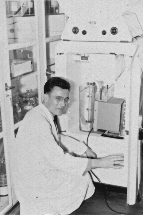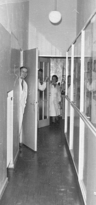 Chemiestudium. Vorlesung. Professor mit Studenten in weißen Kitteln. Alle tragen Hemden mit Krawatten.
