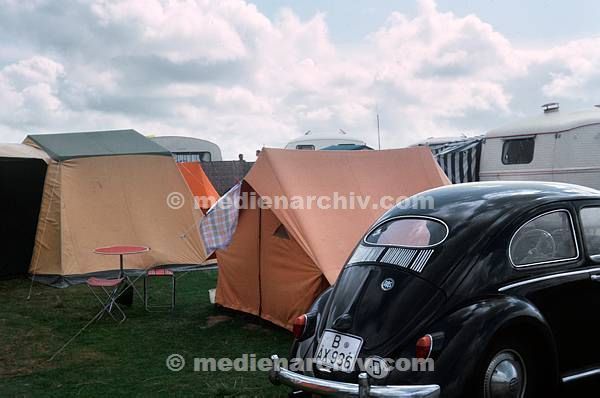 1964. Niedersachsen. Sahlenburg. VW Käfer und Zelte auf einem Campigplatz