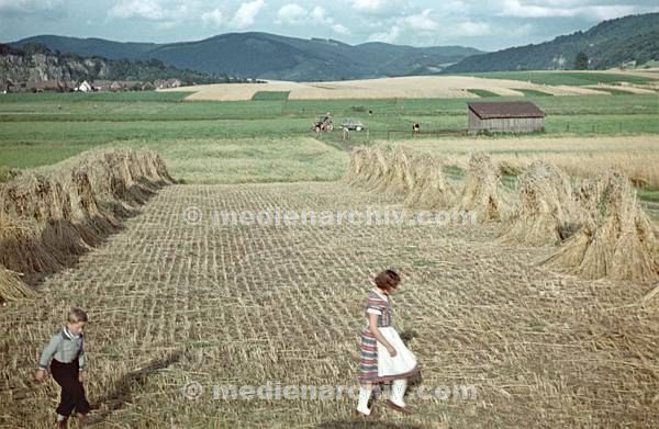 Juli 1957. Niedersachsen. Weserbergland. Kinder auf einem abgeernten Feld