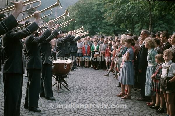 Juli 1957. Rheinland-Pfalz. Cochem Mosel. Blaskonzert der Bundeswehr. Musiker. Kapelle