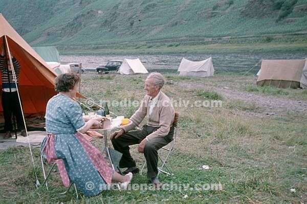 Juli 1957. Rheinland-Pfalz. Cochem Mosel. Campingplatz. Paar vor einem Zelt.