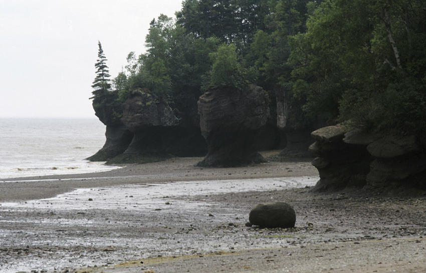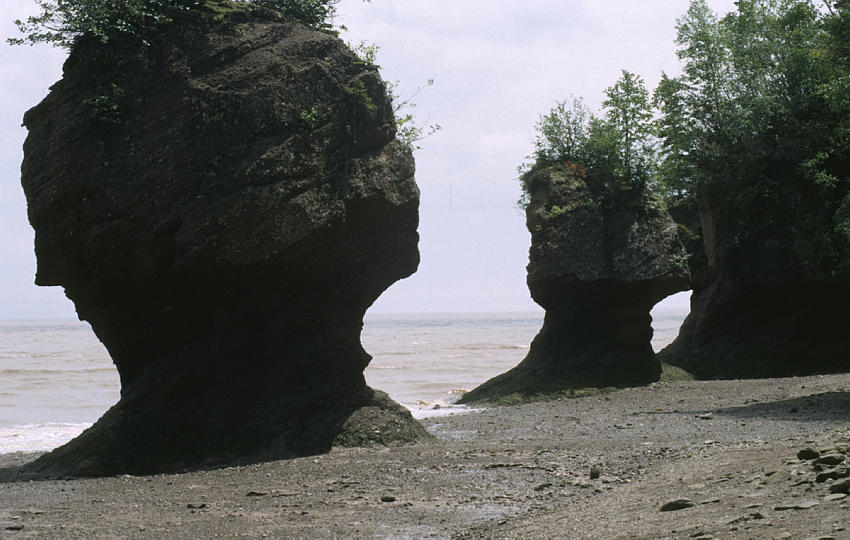 Bei Ebbe sind am Kap Hopwell an der Fundy Bucht hochragende Felsen zu sehen, deren Sockel vom Meer dünner gerieben wurden. Diese Felsskulpturen entstehen an einem Küstenabschnitt mit 16 Metern Tiedenhub.