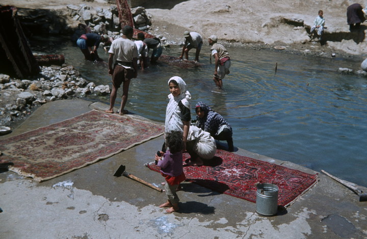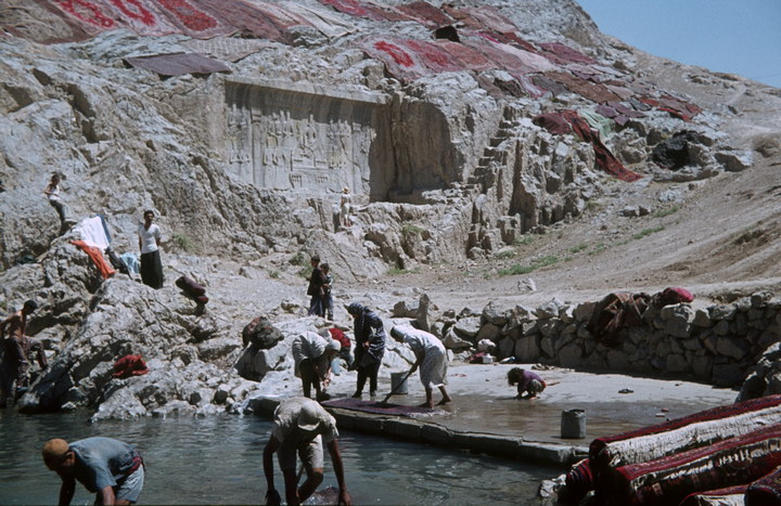 1968. Vorderasien. Nahost. Middle East. Iran. Teheran (Hügel Cheshmeh). Kadscharen-Relief des Fath Ali Schah am Felsen vom CHESHMEH ALI (1797-1834) - Teppichwäsche