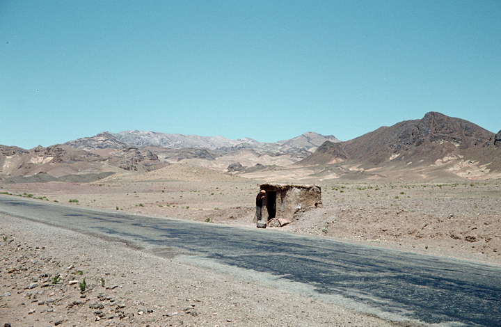 1968. Vorderasien. Nahost. Middle East. Iran. Qom. trinkender Eingeborener, Gebirgsmotiv. Im Vordergrund: Brunnenhaus am Straßenrand