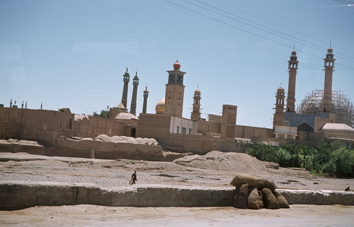1968. Vorderasien. Nahost. Middle East. Iran. Qom. Qom, mit dem ganzen Flussbett, im Vordergrund Säcke an der Strassenbegrenzungsmauer. ähnlich wie vorher, nur ein Teil des Flussbettes