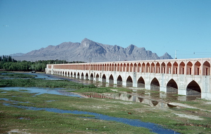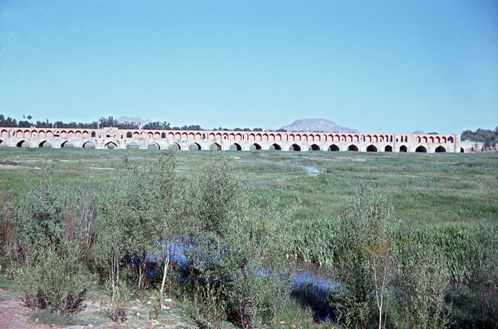 1968. Vorderasien. Nahost. Middle East. Iran. Isfahan (Esphahan). Allahverdi-Khan-Brücke von Osten (Shah Abbas I.) dahinter das Bachtiar-Gebirge