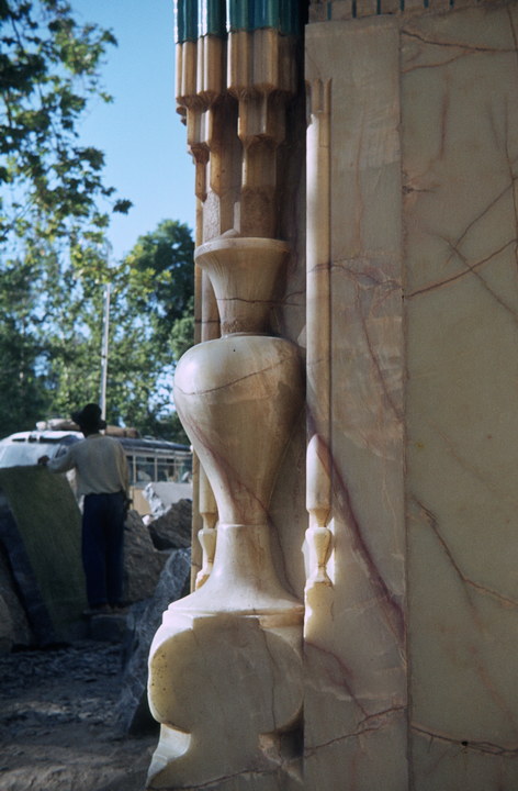1968. Vorderasien. Nahost. Middle East. Iran. Isfahan (Esphahan). Chahar Bagh Medresse (Shah Mutter Moschee) - Alabastersäule neben dem Eingang