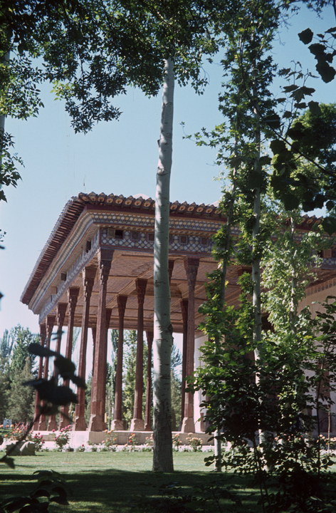 1968. Vorderasien. Nahost. Middle East. Iran. Isfahan (Esphahan). CHEHEL SOTOON, von Shah Abbas II. (1642-1667), Durchblick durch die Säulenhalle. Blick mehr gegen die Decke