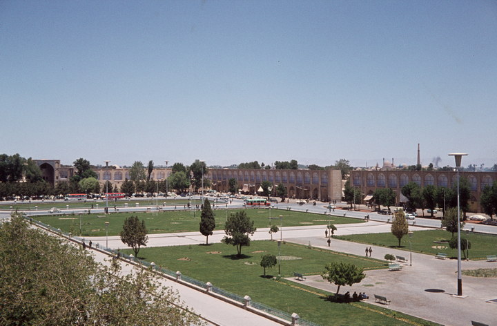 1968. Vorderasien. Nahost. Middle East. Iran. Isfahan (Esphahan). Lotfollah-Moschee .Meidan Shah gegen den Eingang zum Basar, im Hintergrund die Juma-Moschee