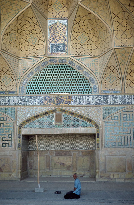 1968. Vorderasien. Nahost. Middle East. Iran. Isfahan (Esphahan). Eingang zur Masdijd in Djomeh (Freitags oder Juma-Moschee) Seitenwand-Detail, Betender