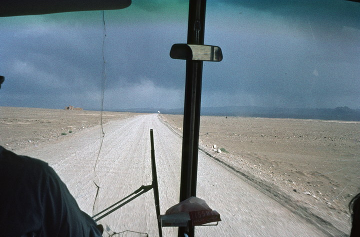 1968. Vorderasien. Nahost. Middle East. Iran. Yezd. Zwischenbild aus dem Autobus, rechts Windhose, Ausläufer der Wüste Lut zwischen Randgebirgen. Reisebus