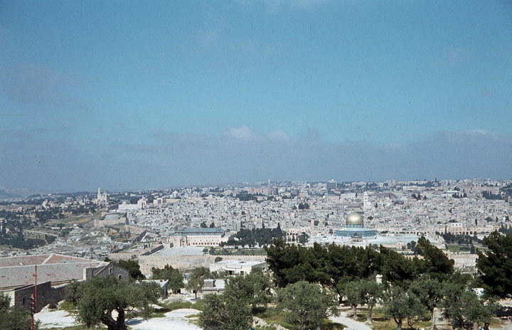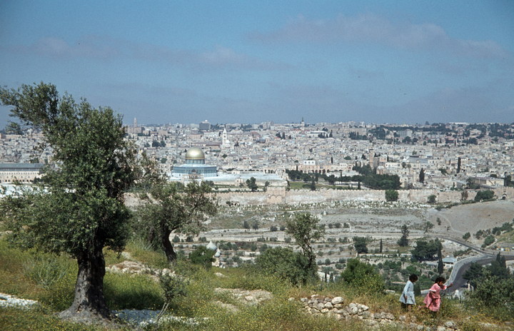 1968. Vorderasien. Nahost. Middle East. Israel. Jerusalem. Blick vom Ölberg, Kettendom-Omar-Moschee, dahinter Erlöserkirche und Grabeskirche; links außerhalb der Mauer die Todesschlaf Mariä-Kirche am Berg Zion, rechts anschließend zwischen den Ölbäumen das Goldene Tor, jedoch liegt das Goldene Tor frei und die russische Maria-Magdalenenkirche (1888 von Zar Alexander III. errichtet) kommt vor.