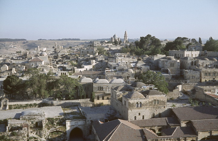 1968. Vorderasien. Nahost. Middle East. Israel. Jerusalem. Neubauten am Rand von Jerusalem -Grabeskirche (Gegenlicht) links Franziskanerkirche