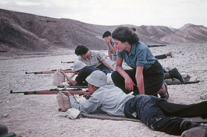 1969. Israel. Ausbildung am Gewehr. Die Schützen liegen und stützen das Gewehr auf kleinen Sandsäcken ab. Eine Ausbilderin erteilt Instruktionen. Die Kleidung wirkt nicht soldatisch, sondern wie Arbeitskleidung im Kibbuz.