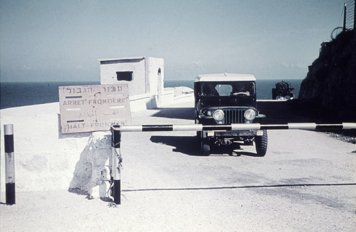 1969. Nahost. Israel. Middle East. Jeep am Schlagbaum. Grenze