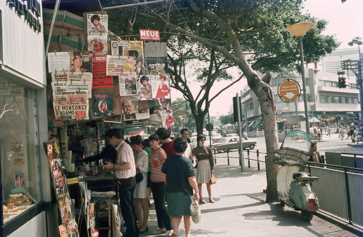 1969. Nahost. Israel. Middle East. Tel Aviv. Jaffa. Am Zeitungskiosk ist die Zeitschrift Burda Moden aus dem März 1969 erkennbar.