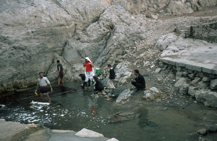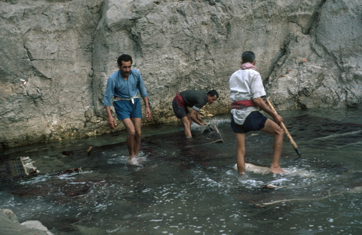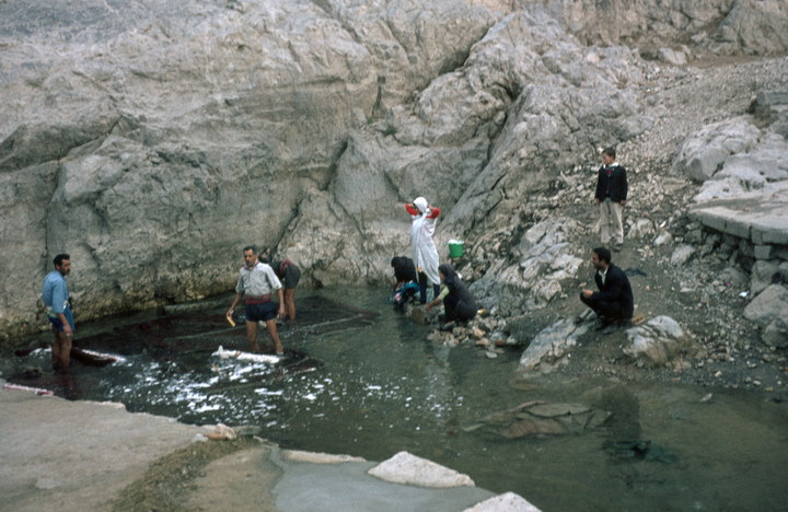 1968. Türkei. Teppichknüpfer waschen ihre Teppiche in einem Wasserbecken.